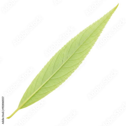 © ViThyTrang, Fototapeta premium Single elongated light green leaf isolated on black background