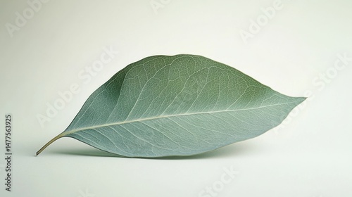 © Pat J., Obraz premium Single eucalyptus leaf isolated on white background with sharp focus clean natural stock photography botanical concept