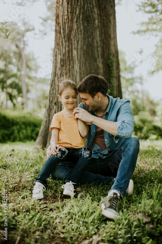Fototapeta premium Single father sitting on grass by the tree with little daughter