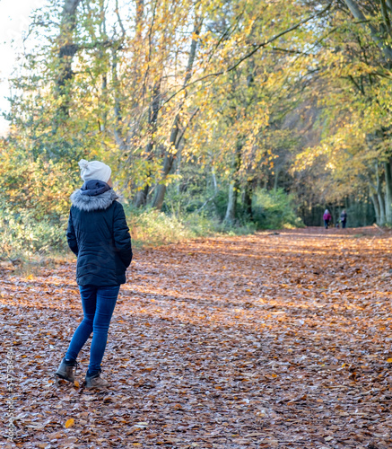 Fototapeta premium Single female enjoying a stroll through a rural woodland on an autumn day