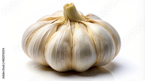 Obraz premium Single, fresh, peeled clove of garlic leaning slightly on its side, isolated against a plain, bright, white background.
