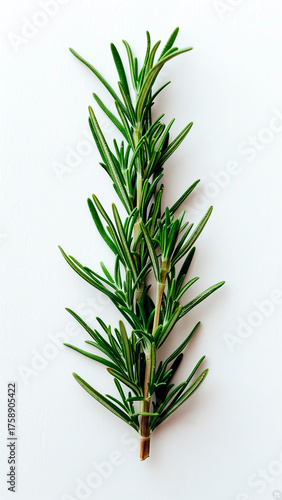 Fototapeta premium Single Fresh Sprig of Rosemary on a White Background. Aromatic Herb, Culinary Spice, Natural Ingredient.