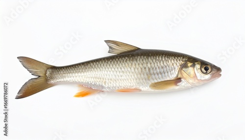 © Studio, Fototapeta premium Single freshwater fish with silvery scales, forked tail, and pointed head, isolated on white background