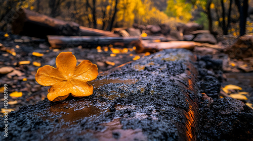 © abid, Fototapeta premium Single golden leaf on a charred log in an autumnal forest.
