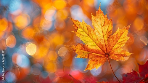 Fototapeta premium Single Golden Maple Leaf Against Bokeh Background