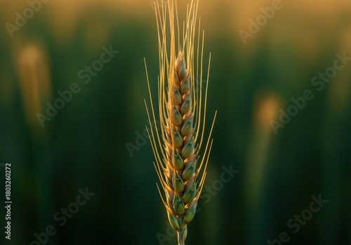 © Meow Creations, Obraz premium Single golden wheat spikelet illuminated by warm sunlight during harvest season.
