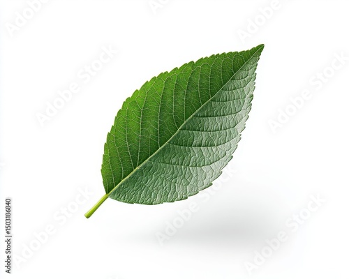 Fototapeta premium Single green leaf floating over white background, simplicity in eco branding