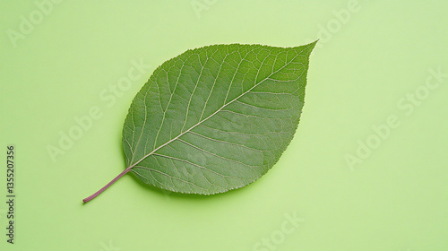 © Farhat Abas, Obraz premium Single green leaf on light green background.