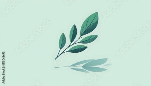© Akram, Obraz premium Single green leaf or branch in flat vector style on plain background with subtle shadow conveying calm meditative nature element and peaceful isolated look