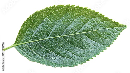 Obraz premium Single Green Leaf with Visible Veins and Textured Surface on White Background