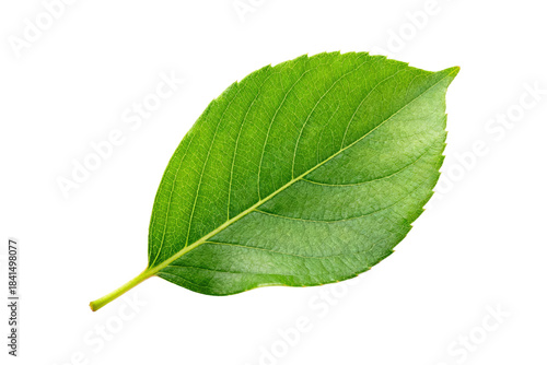 © fanjianhua, Fototapeta premium Single green leaf with visible veins on white background