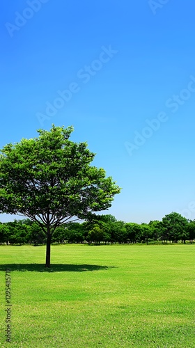 Fototapeta premium Single Green Tree in a Lush Green Field under a Vivid Blue Sky