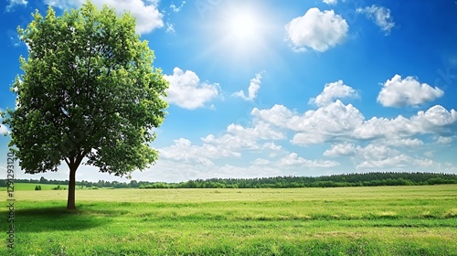 Obraz premium Single Green Tree in a Sunny Field under a Blue Sky