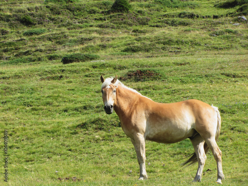 Fototapeta premium Single horse in an alpine pasture . Sesto Dolomites, South Tyrol, Italy