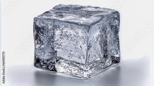 Obraz premium Single Ice Cube on White Reflective Surface - Refreshing Beverage Element, Transparent Texture