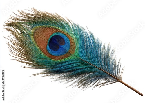 Obraz premium Single iridescent peacock feather, isolated on white (1)