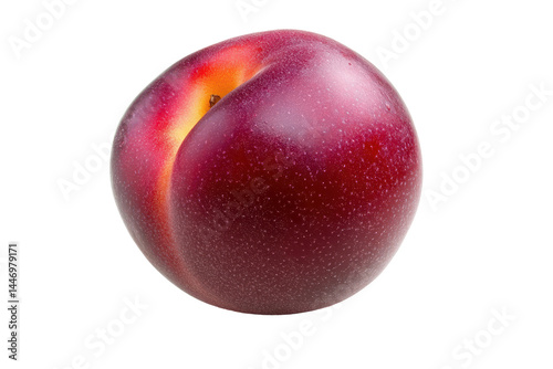 © Agri, Obraz premium Single, isolated, vibrant crimson plum, highlighted against a plain background. Its smooth, textured skin is clearly visible.