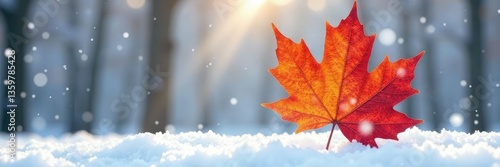 © Prasert, Obraz premium Single large maple leaf on a snowy background, maple leaf, isolated, botanical