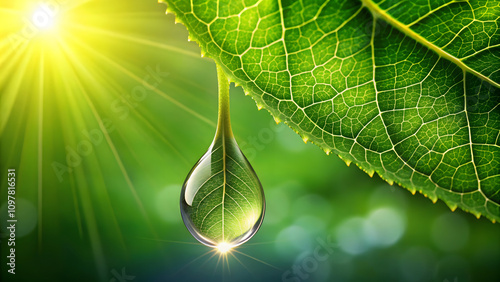 Fototapeta premium single leaf with glowing droplet at its tip, illuminated by sunlight, creates...