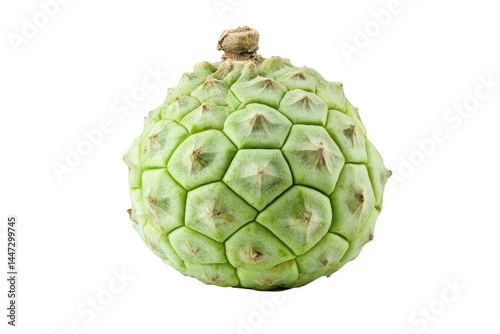Fototapeta premium Single, light green fruit with a distinctly hexagonal, patterned exterior is...