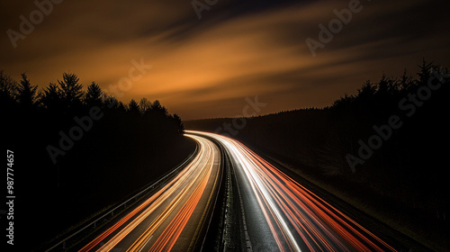 © Vector point, Fototapeta premium single light trail on the freeway at night, At dusk, the car's light rail lights up on the rural highways.