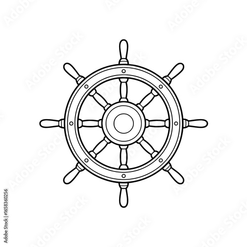 Obraz premium Single Line Art Ship's Wheel Icon: Nautical, Black Outline on White Background