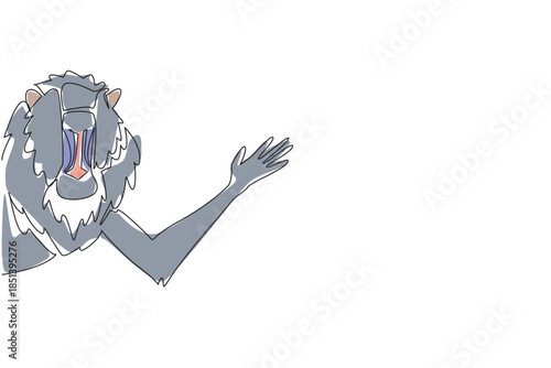 Fototapeta premium Single line drawing shows a mandrill with its hand raised playfully behind a...