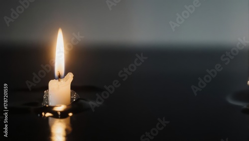 Fototapeta premium Single Lit Candle Illuminating a Dark and Reflective Surface.