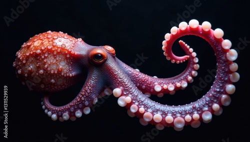 Fototapeta premium Single octopus tentacle with suckers, black backdrop , detail, dark background
