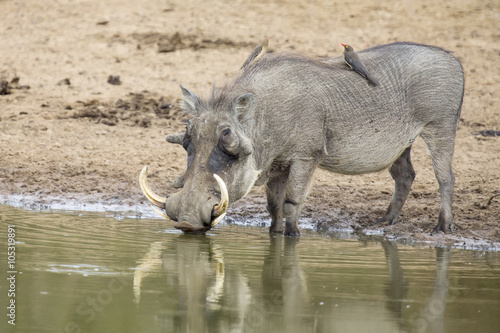 Fototapeta premium Single old Warthog standing at a waterhole drinking