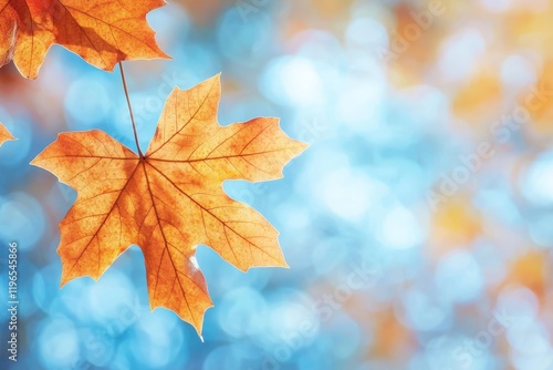© POV Studio, Fototapeta premium Single orange autumn maple leaf on blurred bokeh background.
