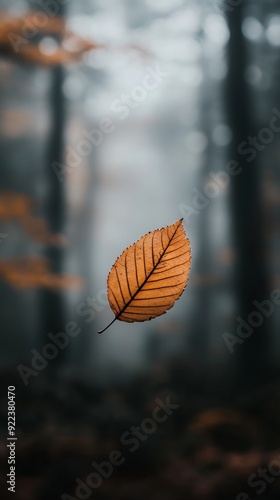 Obraz premium Single orange leaf falling from tree in autumn forest