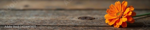© Yasotaro, Fototapeta premium Single orange marigold flower on a wooden surface, texture, simplicity