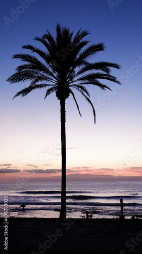 © ThePassenger, Obraz premium Single palm tree in front of the sea at sunset