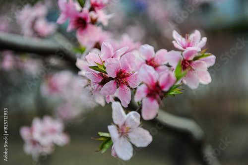 © hong, Fototapeta premium Single peach blossom on a branch in sunlight
