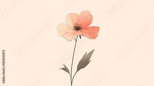 © Arbystudio, Naklejka premium Single Peach-Colored Flower with Stem and Leaves on a Light Peach Background