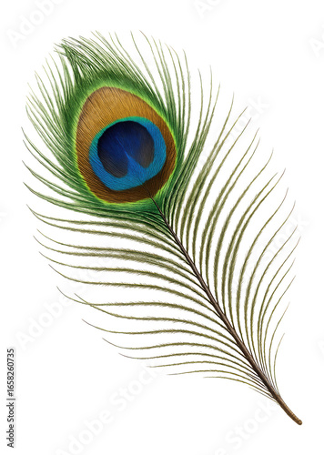 Fototapeta premium Single peacock feather with distinctive eye pattern.