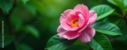 Obraz premium Single pink camellia blossom, lush green background , natural, bloom