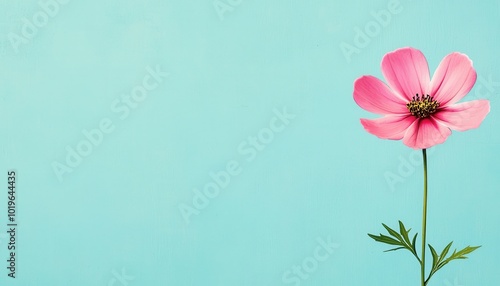 Naklejka premium Single pink flower against a soft blue background, highlighting nature's...