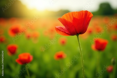 © Pornchai, Fototapeta premium Single poppy in a sunlit spring field, petals unfurling, freshness, flower, background