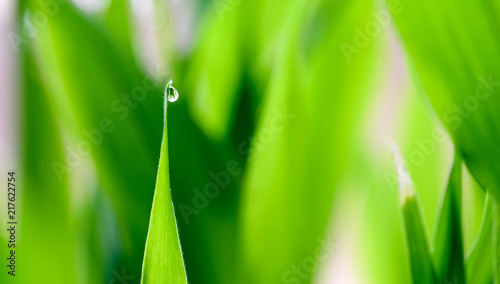 © johndwilliams, Fototapeta premium Single rain water droplet on a green vegetation background with copyspace area for lush gardening ideas using a fresh dew drop concept