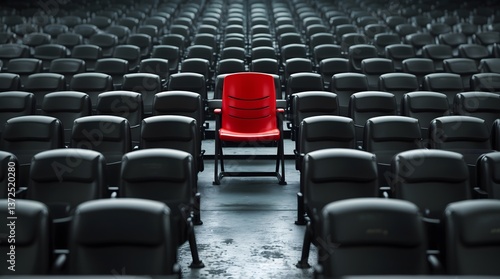 Fototapeta premium Single Red Chair in a Sea of Black Seats - Concept of Uniqueness and...