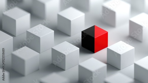 Obraz premium Single Red Cube Among White Cubes on a Soft Grey Background, Symbolizing...