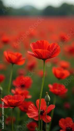 Obraz premium Single red flower, slightly larger than surrounding blooms, in expansive red flower field , red, bloom, beautiful