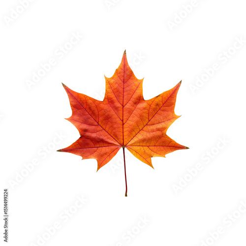Obraz premium Single red-orange autumn maple leaf centered on a plain white backdrop