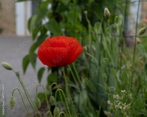 © Hera Yeko, Obraz premium single red poppy on green background. complementary colors
