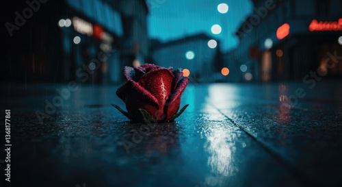 © Artyom, Obraz premium Single red rose lies on wet street at night with bokeh lights in background