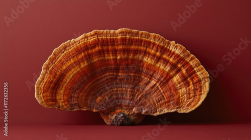 © Boonnam Burart, Obraz premium Single Reishi mushroom isolated on a red background, with sharp focus on its textured surface and earthy tones.
