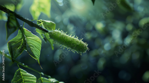 © EnricaDjango, Naklejka premium Single rod shaped bacteria crawling on a green tree branch. high quality photograph