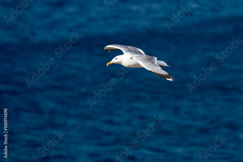 Obraz premium Single Seagull Flying Bird with Open Wings on Clear Blue Sea